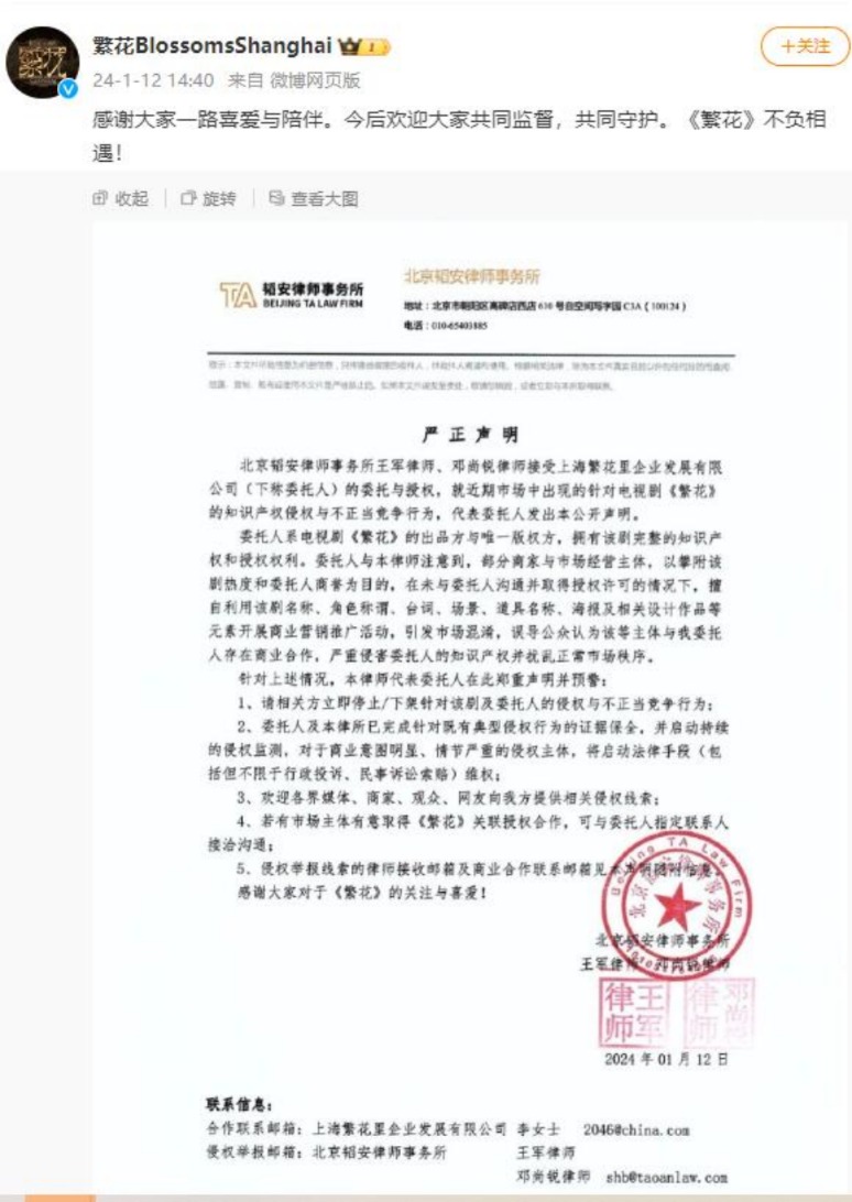 与此同时,一些商家未经授权便在商业营销中使用电视剧《繁花》中的元素,或由此引发侵权风险。1月12日,《繁花》电视剧通过官方微博发布严正声明,要求相关方立即停止/下架针对该剧的侵权与不正当竞争行为。