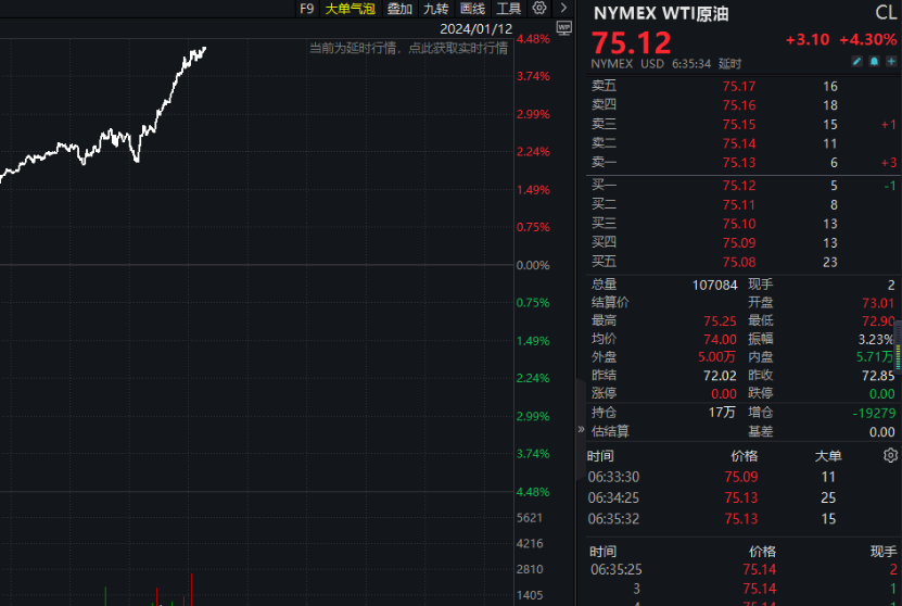 国际消息方面,红海局势紧张升级。在也门胡塞武装遭到美国和英国军队空袭后,国际油价应声飙涨,截至目前,WTI原油期货涨超4%,突破了75美元/桶。也门胡塞武装称,美英“所有利益”都成为其“合法打击目标”。