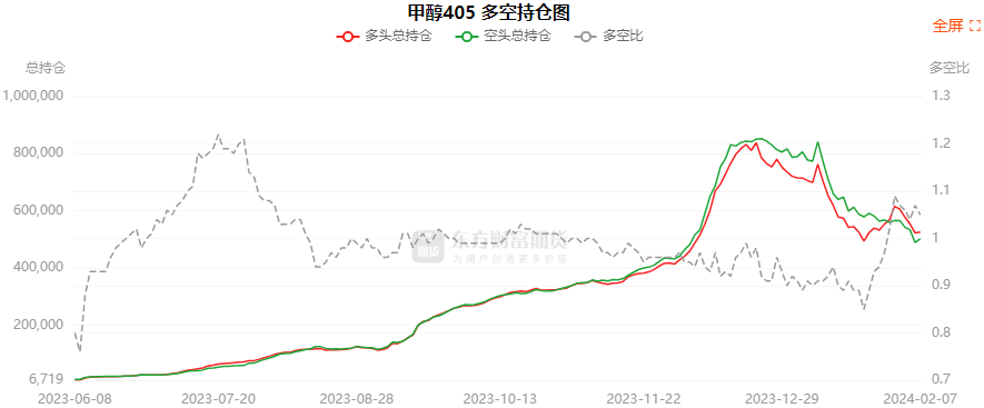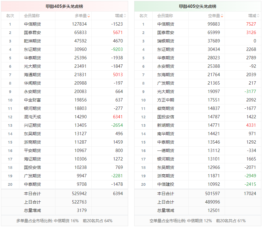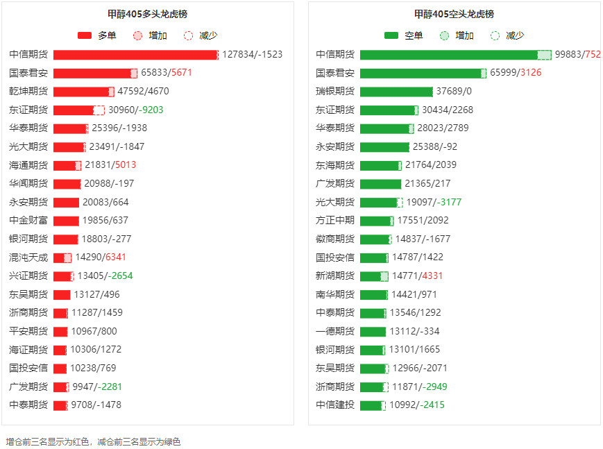 总体而言,甲醇405合约今日增仓上行,多空持仓排名前20席中,多空双方均呈进场态势,多头进场意愿弱于空头。