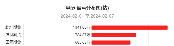 数据显示,一周内乾坤期货、银河期货、国元期货在甲醇上盈利居前,三机构分别盈利1341.00万元,784.87万元,685.63万元。