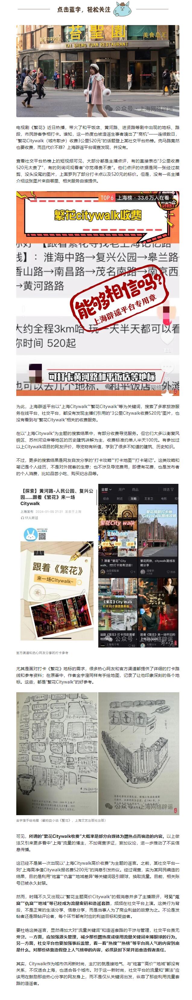 中新网1月10日电上海网络辟谣公众号1月10日发布文章称,“繁花Citywalk(城市散步)收费3公里520元”的话题登上某社交平台热榜。查看社交平台热榜上的短视频可见,大部分都是主播点评。他们点评的依据是同一张经过裁剪、没头没尾的图片,上面罗列了部分打卡点以及520元的标价。但是,没有一名主播介绍这张图片来自哪里、相关服务由谁提供。上海辟谣平台以“上海Citywalk”“繁花Citywalk”等为关键词,搜索了多家旅游服务在线平台、社交平台,都没有发现主播们引用的“3公里Citywalk收费520元”图片,也没有看到与“繁花Citywalk”相关的收费服务。该文章称,“繁花Citywalk收费”大概率是部分自媒体为蹭热点而编造的内容。(中新财经)