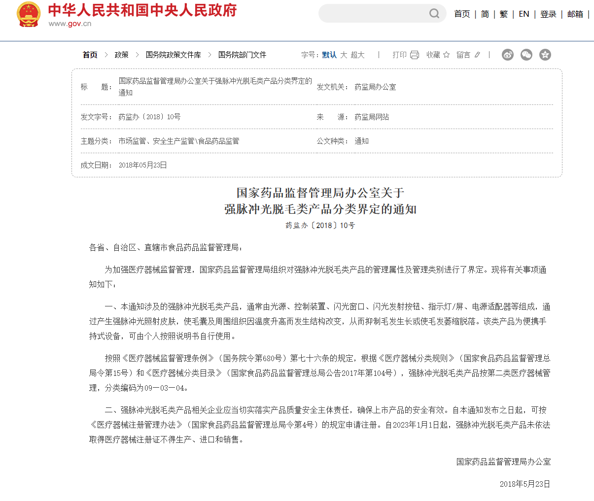 早在2018年5月,国家药监局发布《关于强脉冲光脱毛类产品分类界定的通知》明确,强脉冲光脱毛类产品按第二类医疗器械管理。自2023年1月1日起,强脉冲光脱毛类产品未依法取得医疗器械注册证不得生产、进口和销售。