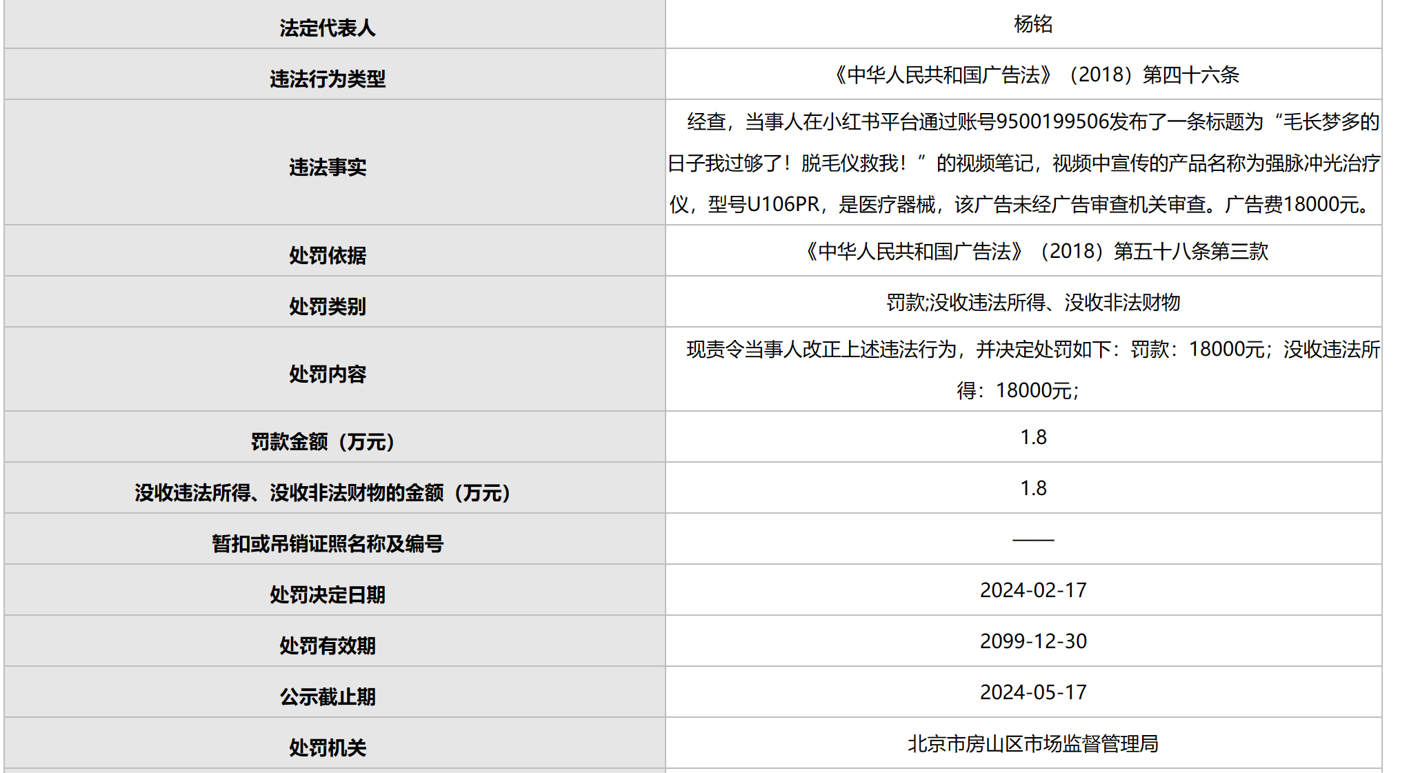 处罚事由显示,当事人在小红书平台发布了一条标题为“毛长梦多的日子我过够了!脱毛仪救我!”的视频笔记,视频中宣传的产品“强脉冲光治疗仪”是医疗器械,该广告未经广告审查机关审查。广告费18000元。