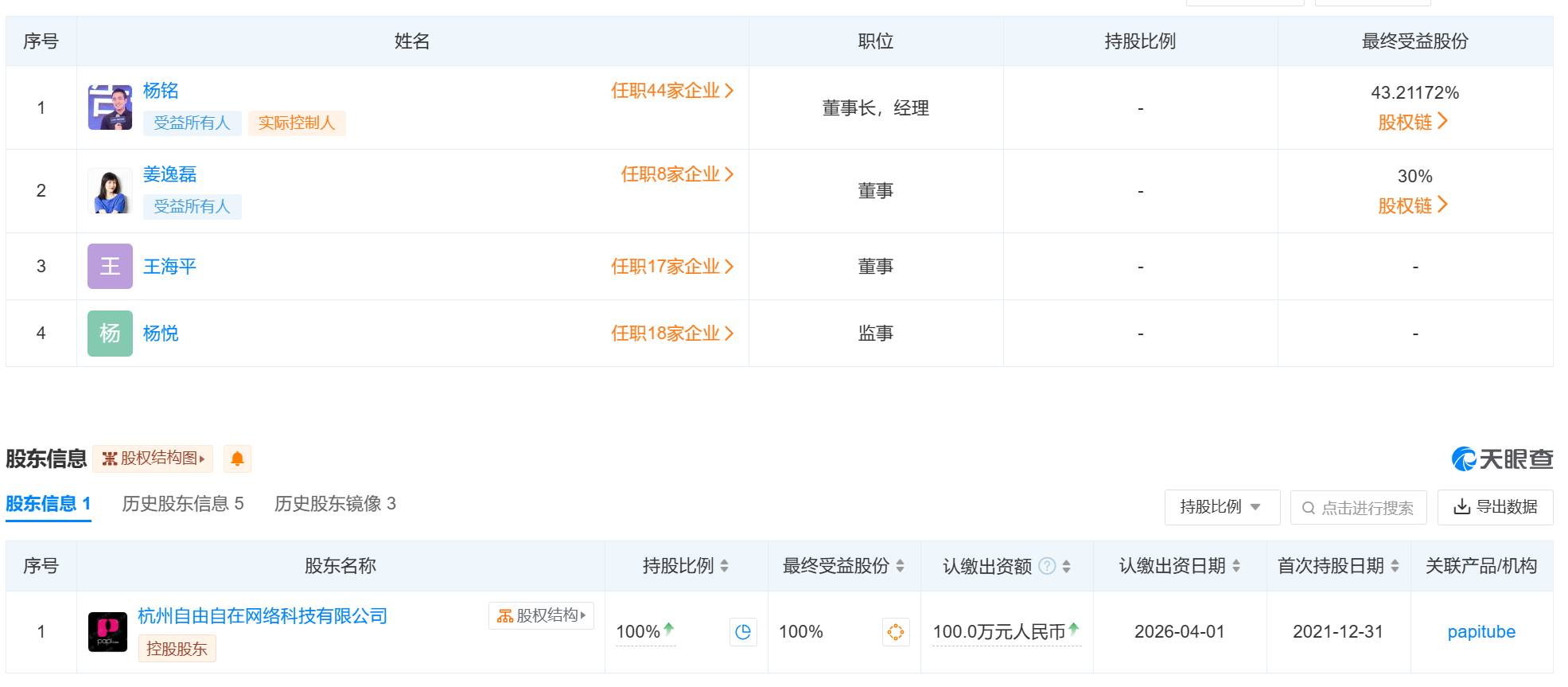 天眼查显示,春雨听雷网络公司法定代表人、董事长、经理为泰洋川禾传创始人杨铭,董事包括姜逸磊(papi酱)。股权穿透图显示,杨铭与姜逸磊均间接持有该公司股份。此外,春雨听雷网络公司由papitube的主体公司杭州自由自在网络科技有限公司全资控股。